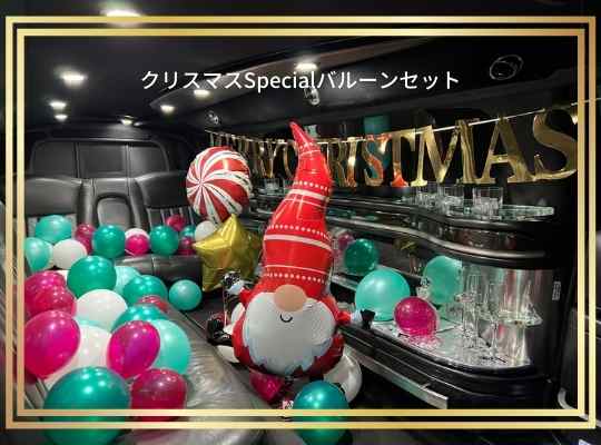 クリスマスカラーの風船とサンタクロースがリムジンでお出迎えします。(オプション)